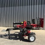 Fendeuse de bûches thermique tractable, montée sur une remorque avec grandes roues de déplacement.